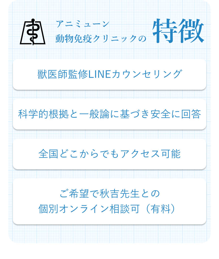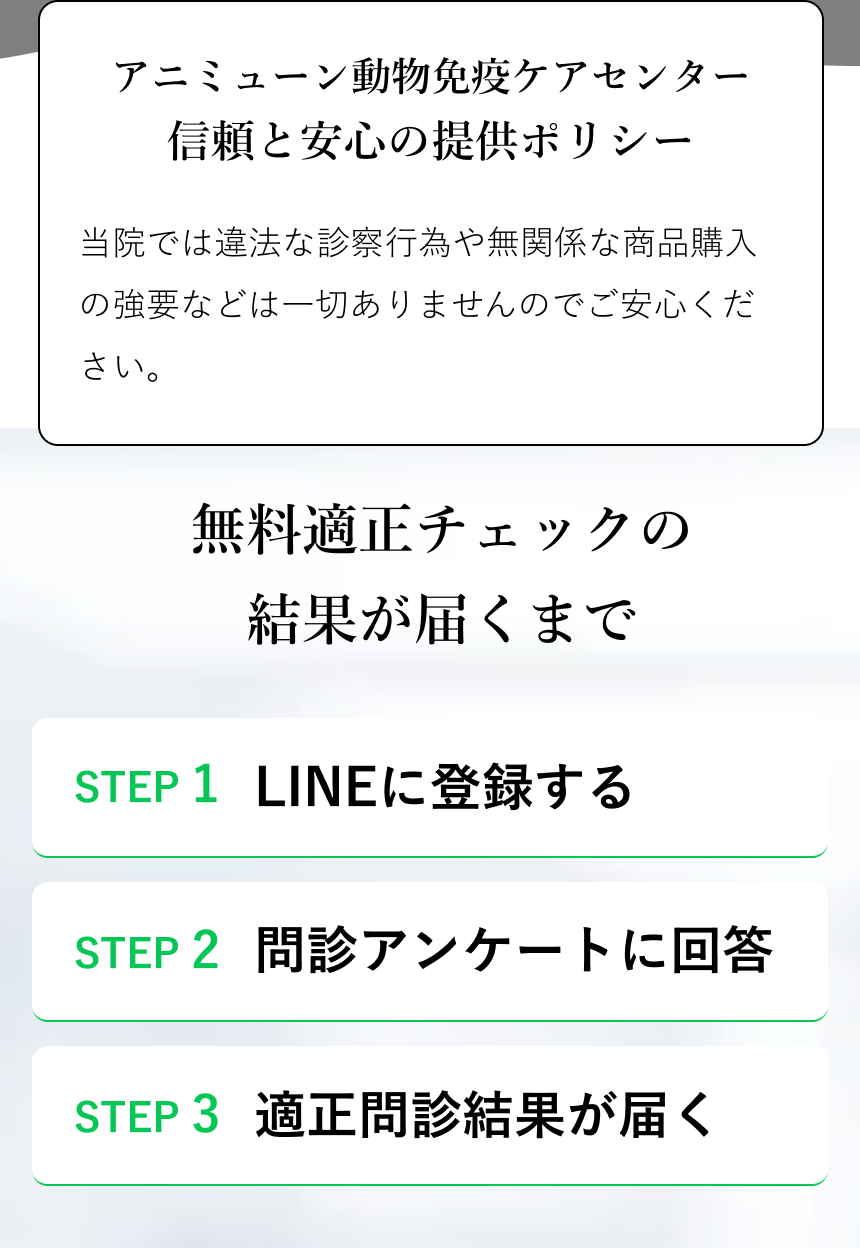以下の内容をよくお読みいただき、「同意する場合に限り」アニミューン動物免疫ケアセンターのLINE適正チェックのボタンをタップし、LINE友だち登録を行っていただくことで、本サービスの利用が開始されます。
