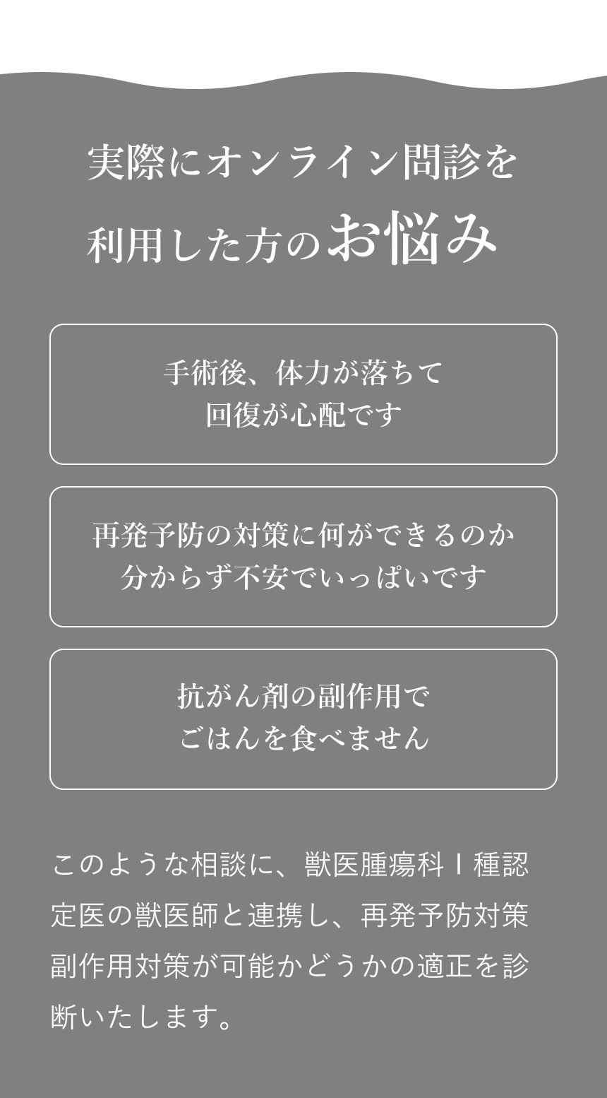 1 緊急症例の対応は行えません。呼吸困難、けいれん、大量出血、極度の衰弱など、緊急性の高い症状については、速やかに最寄りの動物病院で対面診療をお受けください。2 十分な情報が得られない場合の対応ご提供いただいた情報が診断に不十分な場合、適切な判断ができない可能性があります。その際は、対面診療を提案させていただきます。