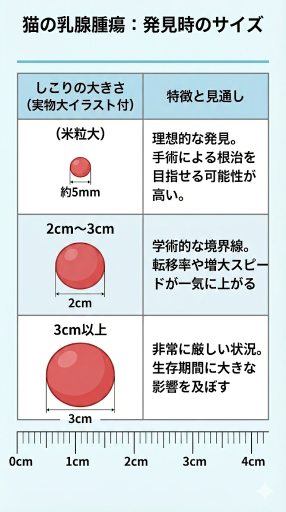 猫の乳腺腫瘍において、予後(その後の経過や寿命)を決定づける最大の要因は、発見時のサイズです。