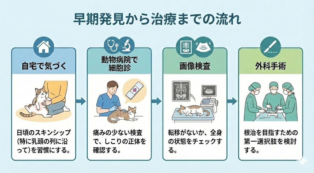 猫ちゃんのしこりは、早く見つけて早く調べる。たったそれだけのことで、広がる選択肢がいくつもあります。