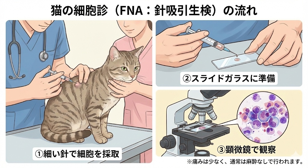 - 内容: 注射針よりも細い針でしこりの細胞を採取し、顕微鏡で確認します。